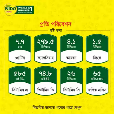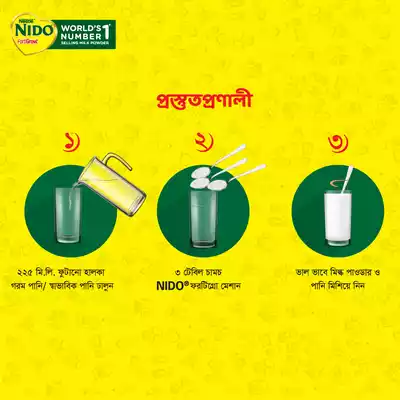 নেস্টলে নিডো ফোর্টিগ্রো ফুল ক্রিম মিল্ক পাউডার হলো একটি উচ্চ পুষ্টিগুণসম্পন্ন দুধের পাউডার, যা শিশুদের বৃদ্ধি ও বিকাশে বিশেষ সহায়ক। এতে রয়েছে পূর্ণ ক্রীমের সমৃদ্ধতা ও ভিটামিন, যা শরীরের শক্তি বৃদ্ধি, হাড় ও মস্তিষ্কের উন্নতিতে সহায়তা করে।